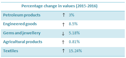 Overall, petroleum products, engineering goods, gems and jewellery were the main export items for the country, and the country's export in 2016 increased in these categories except for gems and jewellery while the highest increase was in textile items.