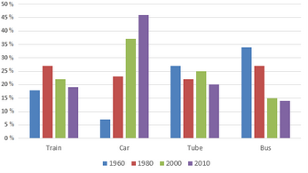 [IELTS Bar Graph: The graph presents percentages of commuters using different modes of transports in London in the years 1960, 1980, 2000 and 2010.]
