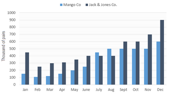 [IELTS Bar Graph: The bar chart below shows the estimated sales of jeans for two companies next year in Turkey. The pie chart shows the projected market share of the two companies in jeans at the end of next year.]