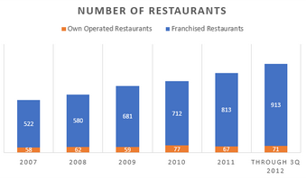 [IELTS Bar Graph: The bar graph below shows the number of own operated and Franchised restaurants from 2007 to 2012 in Someland.]