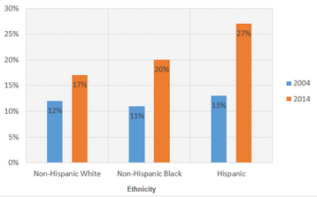 [IELTS Bar Graph: The bar charts below show the prevalence of obesity among boys and girls aged 12 to 19 years by ethnicity, in the United States for the years 2004 and 2014.]