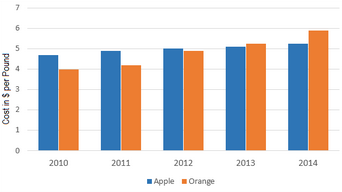 [IELTS Bar Graph: The graph below shows how the prices of apples and oranges changed between 2010 and 2014 in Australia.]