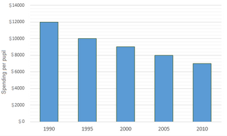 [IELTS Bar Graph: The bar graphs below show the Riverdale Public School’s spending per student in a year as well as percentages of students who passed the reading and math tests from 1990 to 2005.]