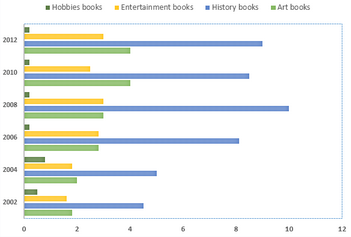 [IELTS Bar Graph: The chart below shows the changes in sales of four different types of books from 2002 to 2012.]