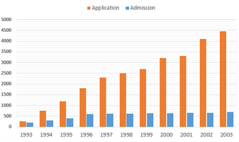 [IELTS Bar Graph: The graph below shows the comparison between the number of applicants and the number of students who were granted admission in a university. ]