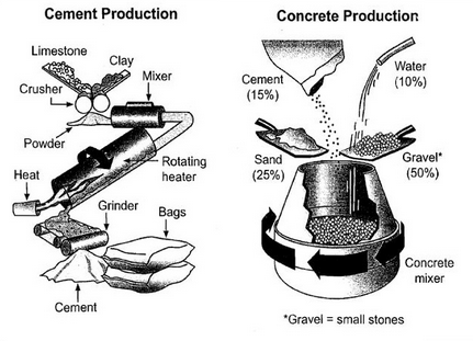 The diagram below shows the stages and equipment used in the cement-making process, and how cement is used to produce concrete for building purposes.