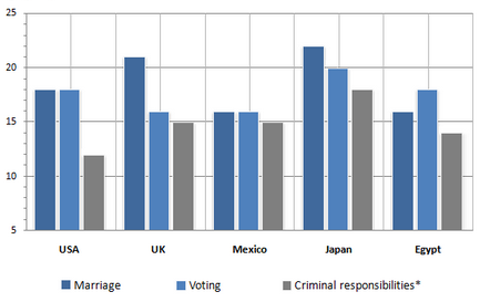 The figure shows the results of a survey of 1000 adolescents in five different countries. The participants were asked at what age they believed certain rights and responsibilities should be granted to young people.