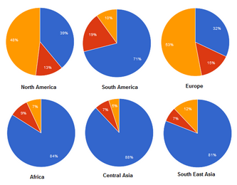 The charts below show the percentage of water used for different purposes in six areas of the world.
