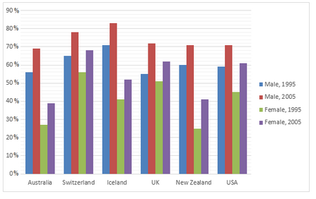 The graph below shows information on employment rates across 6 countries in 1995 and 2005.