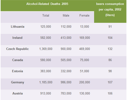 The graph below shows the Alcohol-related deaths in 7 different countries and the average beer consumption in 2005.