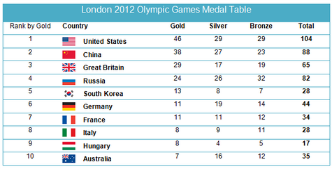 The table below shows the number of medals won by the top ten countries in the London 2012 Olympic Games.