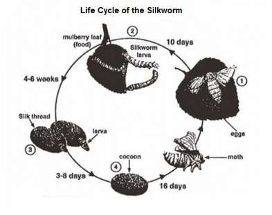 The diagrams below show the life cycle of the silkworm and the stages in the production of silk cloth.