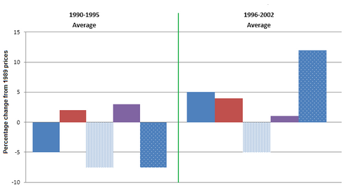 The chart below shows information about changes in average house prices in five different cities between 1990 and 2002 compared with the average house prices in 1989.