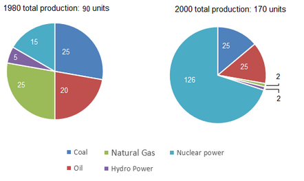 The pie charts below show units of electricity production by fuel source Australia and France in 1980 and 2000.