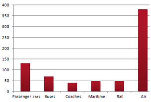 [Bar Graph Question: The table below shows CO2 emissions for different forms of transport in the European Union. The Pie Chart shows the percentage of European Union funds being spent on different forms of transport.]