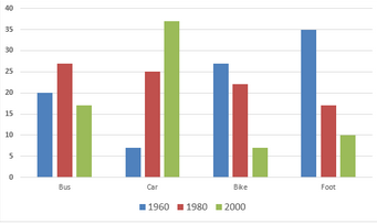 [Bar Graph Question: The graph below shows the different modes of transport used to travel to and from work in one European city in 1960, 1980 and 2000.]