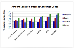 [Bar Graph Question: The bar chart below gives information about four countries spending habits of shopping on consumer goods in 2012.]