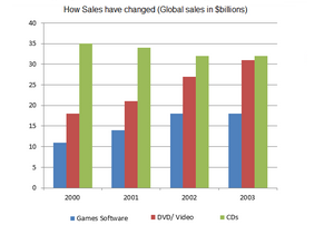 [Bar Graph Question: The chart below gives information about global sales of games software, CDs and DVD or video.]