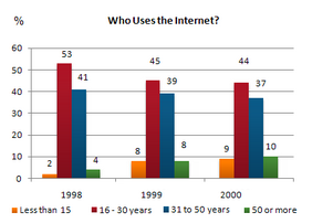 [Bar Graph Question: The graph shows Internet Usage in Taiwan by Age Group, 1998-2000.]