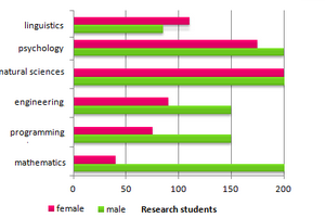 [Bar Graph Question: The bar graph below shows the numbers of male and female research students studying six subjects at a US university in 2011.]