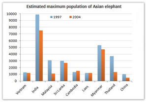 [Bar Graph Question: The graph below shows the changes in maximum number of Asian elephants between 1994 and 2007.]