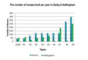 [Bar Graph Question: The diagram below shows the number of houses built per year in two cities, Derby and Nottingham, Between 2000 and 2009.]
