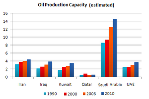 [Bar Graph Question: The graph shows estimated oil production capacity for several Gulf countries between 1990 and 2010.]