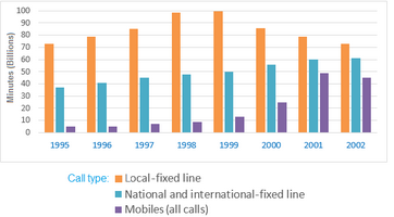 [Bar Graph Question: The chart below shows the total number of minutes (in billions) of telephone calls in the UK, divided into three categories, from 1995-2002. ]