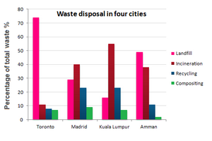 [Bar Graph Question: The bar chart shows different methods of waste disposal in four cities: Toronto, Madrid, Kuala Lumpur and Amman.]