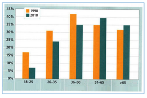 [IELTS Bar Graph: The chart below gives information on the percentage of British people giving money to charity by age range for the years 1990 and 2010.]