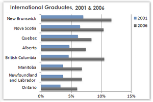 [IELTS Bar Graph: The chart below shows the percentage change in the share of international students among university graduates in different Canadian provinces between 2001 and 2006.]