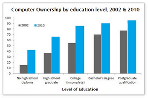 [IELTS Bar Graph: The graphs below give information about computer ownership as a percentage of the population between 2002 and 2010, and by level of education for the years 2002 and 2010.]