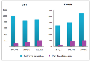 [IELTS Bar Graph: The chart below shows the number of men and women (in thousand) in further education in Britain in three periods and whether they were studying full-time or part-time.]