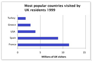 [IELTS Bar Graph: The charts below give information about travel to and from the UK, and about the most popular countries for UK residents to visit.]