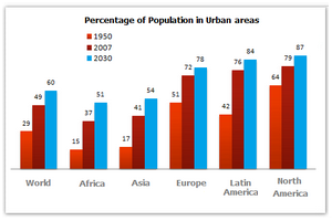 [IELTS Bar Graph: The bar chart below gives information about the percentage of the population living in urban areas in the world and in different continents.]