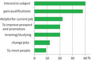 [IELTS Bar Graph: The charts below show the result of a survey of adult education. The first chart shows the reason why adults decide to study. The pie chart shows how people think the costs of adult education should be shared.]