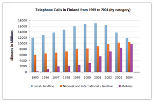 [IELTS Bar Graph: The chart below shows the total number of minutes (in millions) of telephone calls in Finland, divided into three categories, from 1995 – 2004.]