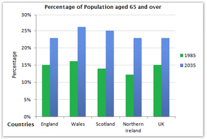 [IELTS Bar Graph: The chart below gives information about the UK's ageing population in 1985 and makes predictions for 2035.]