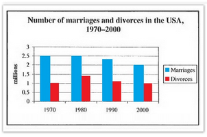 [IELTS Bar Graph: The charts below give information about USA marriage and divorce rates between 1970 and 2000, and the marital status of adult Americans in two of the years.]