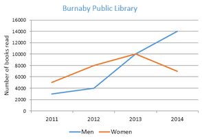 [Line Graph: The graph below shows the number of books read by men and women at Burnaby Public Library from 2011 to 2014.]