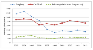 [Line Graph: The chart below shows the changes that took place in three different areas of crime in New Port city center from 2003-2012.]