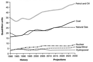 [Line Graph: The graph below gives information from a 2008 report about consumption of energy in the USA since 1980 with projections until 2030.]
