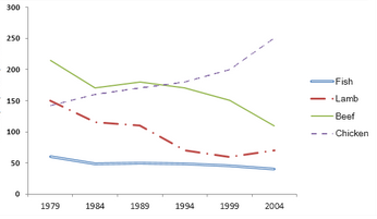 [Line Graph: The graph below shows the consumption of fish and different kinds of meat in a European country between 1979 and 2004.]