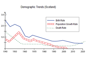 [Line Graph: The figure shows demographic trends in Scotland. Summarise the information by selecting and reporting the main feature.]