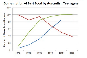 [Line Graph: The line graph below shows changes in the amount and type of fast food consumed by Australian teenagers from 1975 to 2000.]