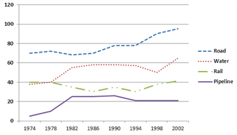 [Line Graph: The graph below shows the quantities of goods transported in the UK between 1974 and 2002 by four different modes of transport.]