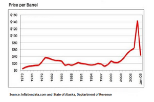 [Line Graph: The line graph shows the historical oil prices per barrel from 1973 to January 2009.]