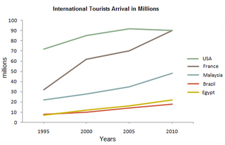 [Line Graph: The graph below gives information about international tourist arrivals in five countries.]