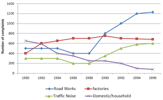 [Line Graph: The graph below shows the number of complaints made about noise to Environmental Health authorities in the city of Newtown between 1980 and 1996.]