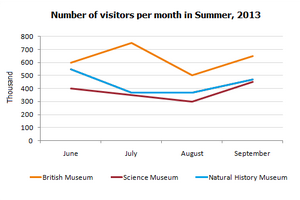 [Line Graph: The line graph below gives information about the number of visitors to three London museums between June and September 2013.]